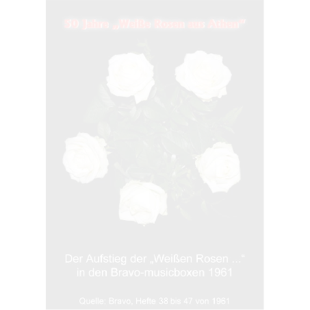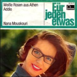 Der Weg an die SpitzeNana Mouskouri stürmte mit ihrem ersten großen Titel unaufhaltsam an die Spitze derHitlisten. In der "Bravo" Nummer 39/1961 in der Rubrik " Plattentipp von Paulchen Süß" unterder Überschrift "Eine Könnerin - eine Künstlerin" war folgendes zu lesen: "... Musik: Manos Hadjidakis schrieb diese Melodien (Addio / Weiße Rosen aus Athen, d.Verf.) für den großartigen Griechenland- Film TRAUMLAND DER SEHNSUCHT, der bei derBerlinale preisgekrönt wurde. Auch diese Lieder haben den bittersüßen Reiz, der uns schonbei "Ein Schiff wird kommen" bezauberte. Texte: Leider ist Paulchen der griechischen Sprache nicht genügend mächtig, um dieOriginalverse (Fontana 466 022) verstehen zu können. Bei der Übersetzung wurden darauszwei der so gefragten Seemann -Songs. Arrangements: Ebenso einfach und schlicht wie die Melodien, die eigentlich moderneVolksweisen sind. Sängerin: Diese Platte ist schon ein Erfolg. Das Publikum hat Nana Mouskouri also bereitsgewählt. Doch Paulchen möchte den allgemeinen Applaus noch ein bißchen verstärken -denn das ist eine Könnerin und Künstlerin! In vier Worten: Muß man gehört haben!"Hier nun die Etappen des Weges an die Spitze der Hitlisten, dargestellt anhand der "Bravo-mucicbox" in den Kalenderwochen (KW38bis 47 des Jahres 1961. Dabei war der Verlauf des Weges der "Weißen Rosen ..." an die Spitze der Deutschen Single-Chartsannähernd identisch mit dem in der Bravo-mucibox, den heutigen Bravo-Charts.38. Kalenderwoche 19611. Platz: Connie Francis mit "Schöner fremder Mann"11. Platz: Nana Mouskouri mit "Weiße Rosen aus Athen"39. Kalenderwoche 19611. Platz: Freddy mit "La Paloma" 8. Platz: Nana Mouskouri mit "Weiße Rosen aus Athen"40. Kalenderwoche 19611. Platz: Freddy mit "La Paloma" 7. Platz: Nana Mouskouri mit "Weiße Rosen aus Athen"41. Kalenderwoche 19611. Platz: Freddy mit "La Paloma" 5. Platz: Nana Mouskouri mit "Weiße Rosen aus Athen"42. Kalenderwoche 19611. Platz: Freddy mit "La Paloma" 4. Platz: Nana Mouskouri mit "Weiße Rosen aus Athen"43. Kalenderwoche 19611. Platz: Freddy mit "La Paloma" 4. Platz: Nana Mouskouri mit "Weiße Rosen aus Athen"44. Kalenderwoche 19611. Platz: Gus Backus mit "Der Mann im Mond" 3. Platz: Nana Mouskouri mit "Weiße Rosen aus Athen"45. Kalenderwoche 19611. Platz: Gus Backus mit "Der Mann im Mond" 2. Platz: Nana Mouskouri mit "Weiße Rosen aus Athen"46. Kalenderwoche 19611. Platz: Gus Backus mit "Der Mann im Mond" 2. Platz: Nana Mouskouri mit "Weiße Rosen aus Athen"47. Kalenderwoche 19611. Platz: Nana Mouskouri mit "Weiße Rosen aus Athen"Die Erfolgstitel von Manos Hadjidakis, einem der erfolgreichsten europäischen Komponisten, schafften fast zeitgleich den Sprung übers"Große Wasser". So belegte das Lied "Ta pedia tou Pirea" (deutscher Name "Ein Schiff wird kommen") unter dem Namen desgleichnamigen Films mit Melina Mercouri "Never on Sunday", interpretiert von der Vocal-Gruppe “The Cordettes”, in den US-Chartsim Juli 1961 den vierten Platz.Bevor Nana Mouskouri mit ihren "Weißen Rosen ..." in der 47. Kalenderwoche Platz 1 der deutschen Bravo-musicbox erreichte, warendie folgenden Sängerinnen und Sänger mit ihren damals aktuellen Titeln jeweils auf Platz 1 und damit ihre unmittelbaren Mitbewerberum die Gunst des Publikums: Lale Anderson mit ihren Titeln "Never on Sunday" & "Ein Schiff wird kommen",Connie Francis mitihrem Erfolgsschlager "Schöner fremder Mann", Freddy Quinn mit "La Paloma" und Gus Backus mit "Der Mann im Mond".Neben den deutschen Erfolgen bewegte sich Nana Mouskouri zunehmend auf weltweitem Parkett. Viele Künstler beeinflussten sie mitihren Liedern und wurden zu ihren Freunden, darunter die folgenden: